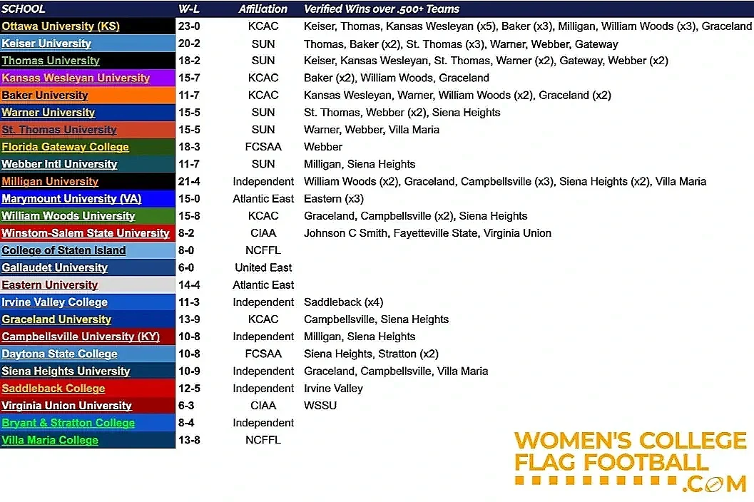 PLEASE READ: A unique challenge in Women’s College Flag Football is that so many types of colleges at varying competition levels are competing across the country. Teams compete across divisions and conferences. Here at WCFFB, we decided to collect all of the reliable data we could to develop a comprehensive ranking system for all teams competing across the country. Teams report their wins and losses differently, but we do our best to evaluate their records. We value wins over +.500 teams as key wins, total wins, and win % to develop our ranking. The rankings represented here are solely the opinion of Women’s College Flag Football .com. As always, please submit any scores, data or corrections through the contact page.